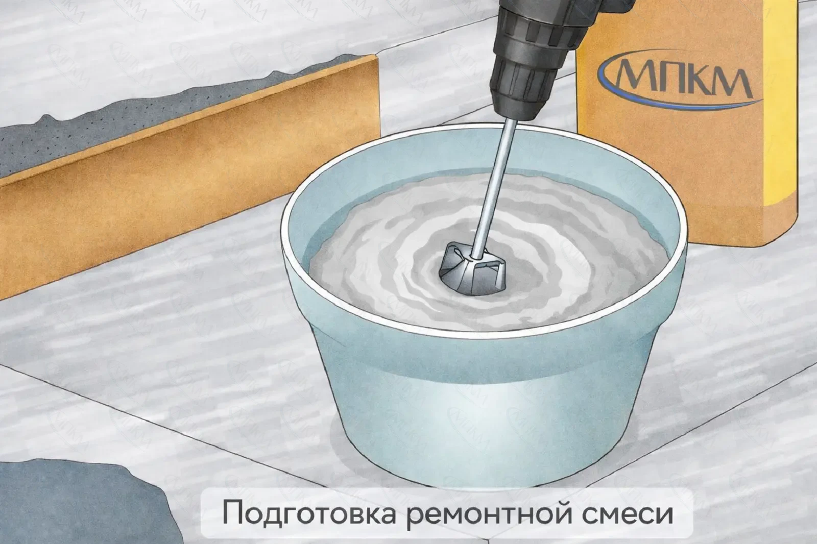 - Засыпьте сухую ремонтную смесь и перемешайте до однородности.