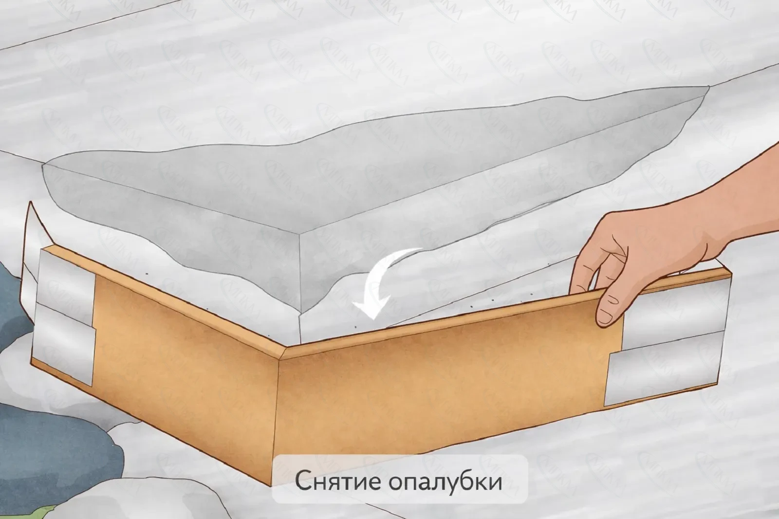 Опалубку снимают после набора первичной прочности, чтобы не сколоть свежую кромку. Срок зависит от состава и температуры.