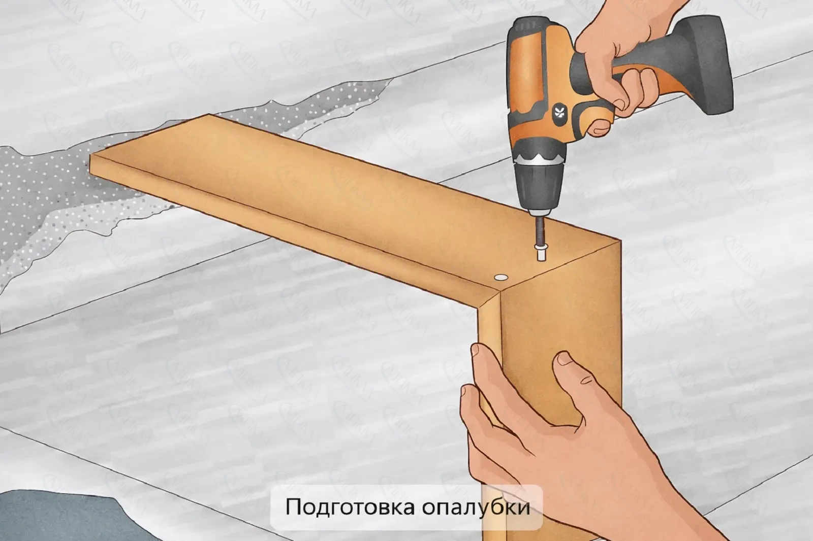 - Опалубка: доска/фанера, саморезы, шуруповёрт, малярная лента (скотч) для герметизации стыка.