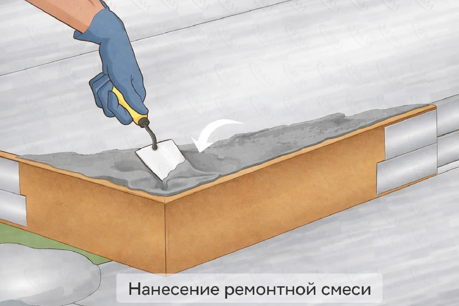 - Нанесите смесь и уплотните её по всей карте ремонта.