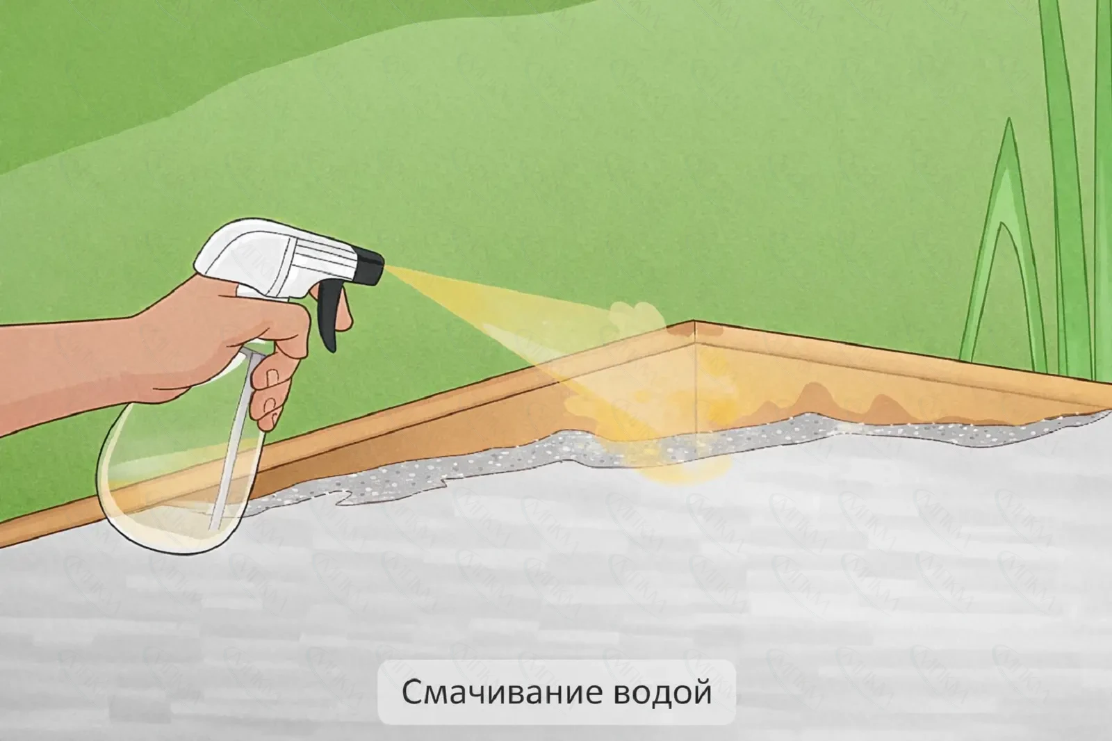 - Смочите зону ремонта распылителем.