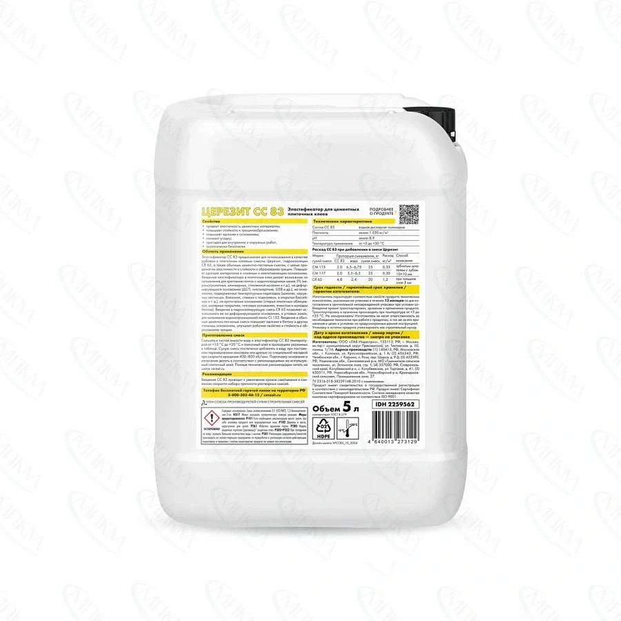 Ceresit CC 83 — это эластификатор на основе водной дисперсии полимеров, предназначенный для добавления в цементные, плиточные клеевые и гидроизоляционные смеси. Продукт повышает эластичность, адгезию и трещиностойкость растворов, снижает усадку и улучшает рабочие свойства смесей при внутренних и наружных работах.