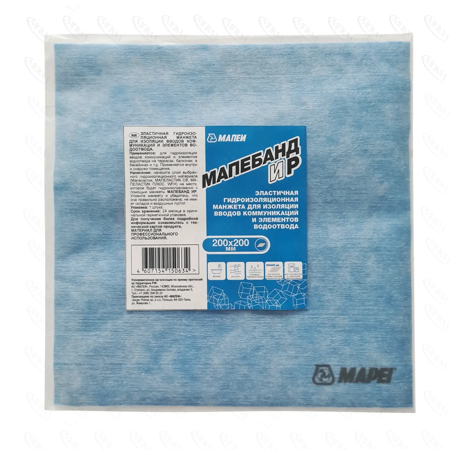 МАПЕБАНД ИР 200×200 — это гидроизоляционная манжета из ПВХ размером 20×20 см для герметизации мест прохода труб и закладных элементов в системах гидроизоляции. Элемент выполнен из эластичной водо- и паронепроницаемой основы, расположенной между слоями щелочестойкого нетканого полипропиленового полотна, что обеспечивает надежное приклеивание в гидроизоляционных системах.