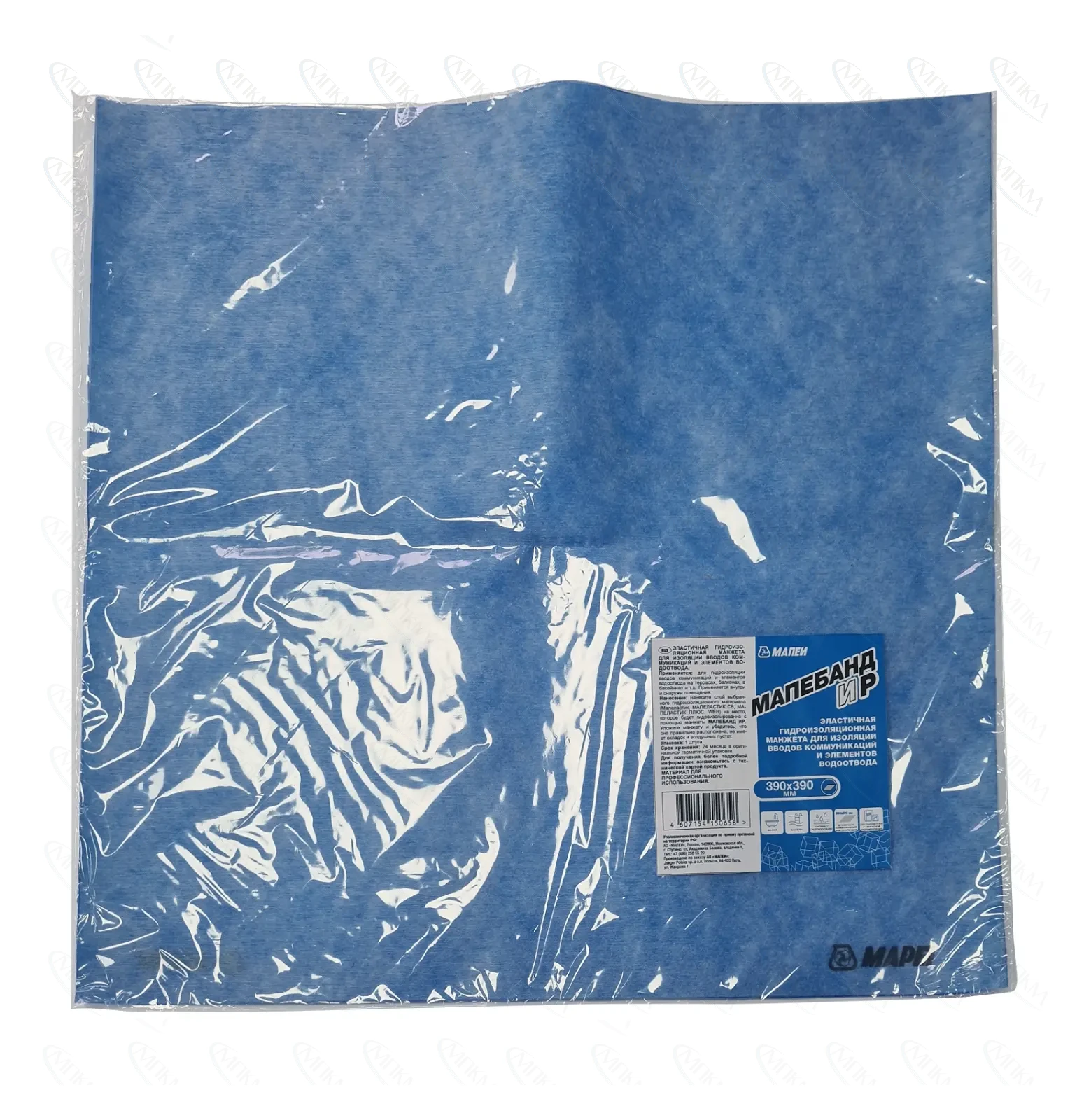 МАПЕБАНД ИР 390×390 — это гидроизоляционная манжета из ПВХ размером 39×39 см для герметизации крупных проходов труб и закладных элементов в гидроизоляционных системах. Манжета выполнена из эластичной водо- и паронепроницаемой основы между слоями щелочестойкого нетканого полипропиленового полотна.