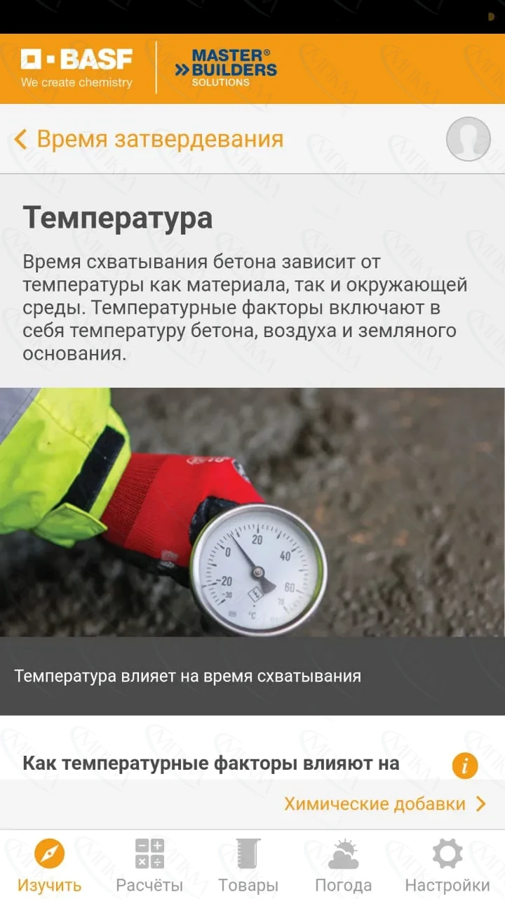 Бесплатное приложение MyConcrete предназначено для подрядчиков, инженеров, архитекторов и производителей. Оно предоставляет информацию о характеристиках и возможностях использования продуктов BASF, а также о влиянии внешних факторов на пластичность, количество вовлеченного воздуха, способность к финишной затирке и времени твердения бетона.