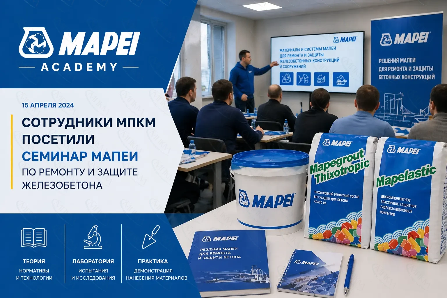 15 апреля сотрудники ООО «МПКМ» посетили практический семинар МАПЕИ «Материалы и системы МАПЕИ для ремонта и защиты железобетонных конструкций и сооружений». Мероприятие прошло в тренинг-центре МАПЕИ Академия в Ступино.