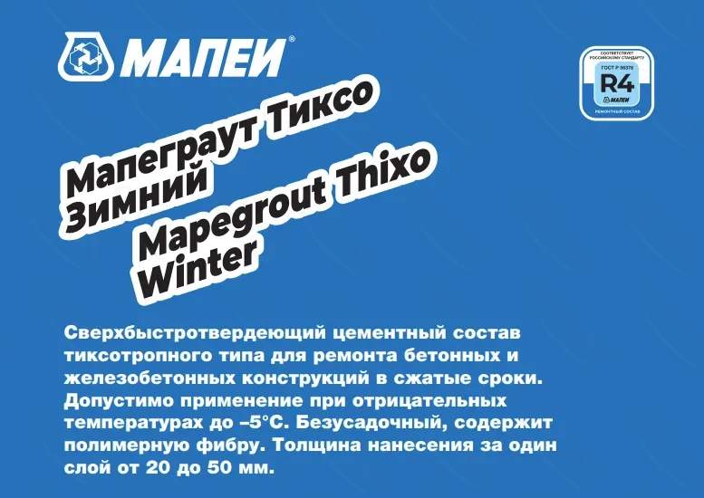 Стартовали продажи нового продукта — «Мапеграут Тиксо Зимний». Несмотря на «зимнее» название, материал ориентирован на задачи оперативного ремонта высокопрочного бетона в стандартных условиях (при положительных температурах) и позволяет выполнять работы без устройства опалубки. При соблюдении технологических требований допускается применение и при пониженных температурах — до -5 °C.