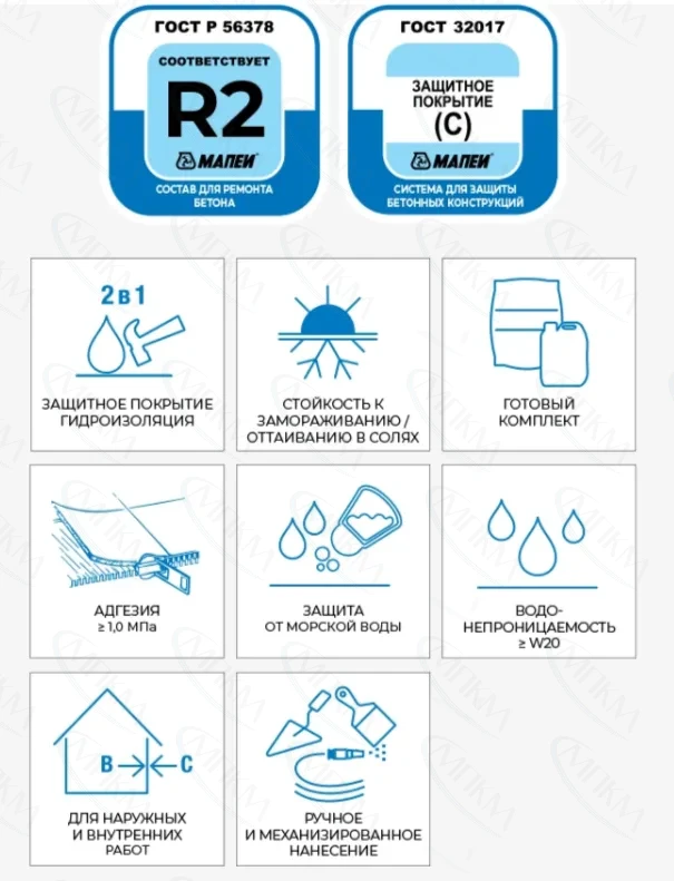 - Двухкомпонентный раствор обеспечивает высокую адгезию к разным типам оснований: бетон, цементная штукатурка, кирпич и блок.