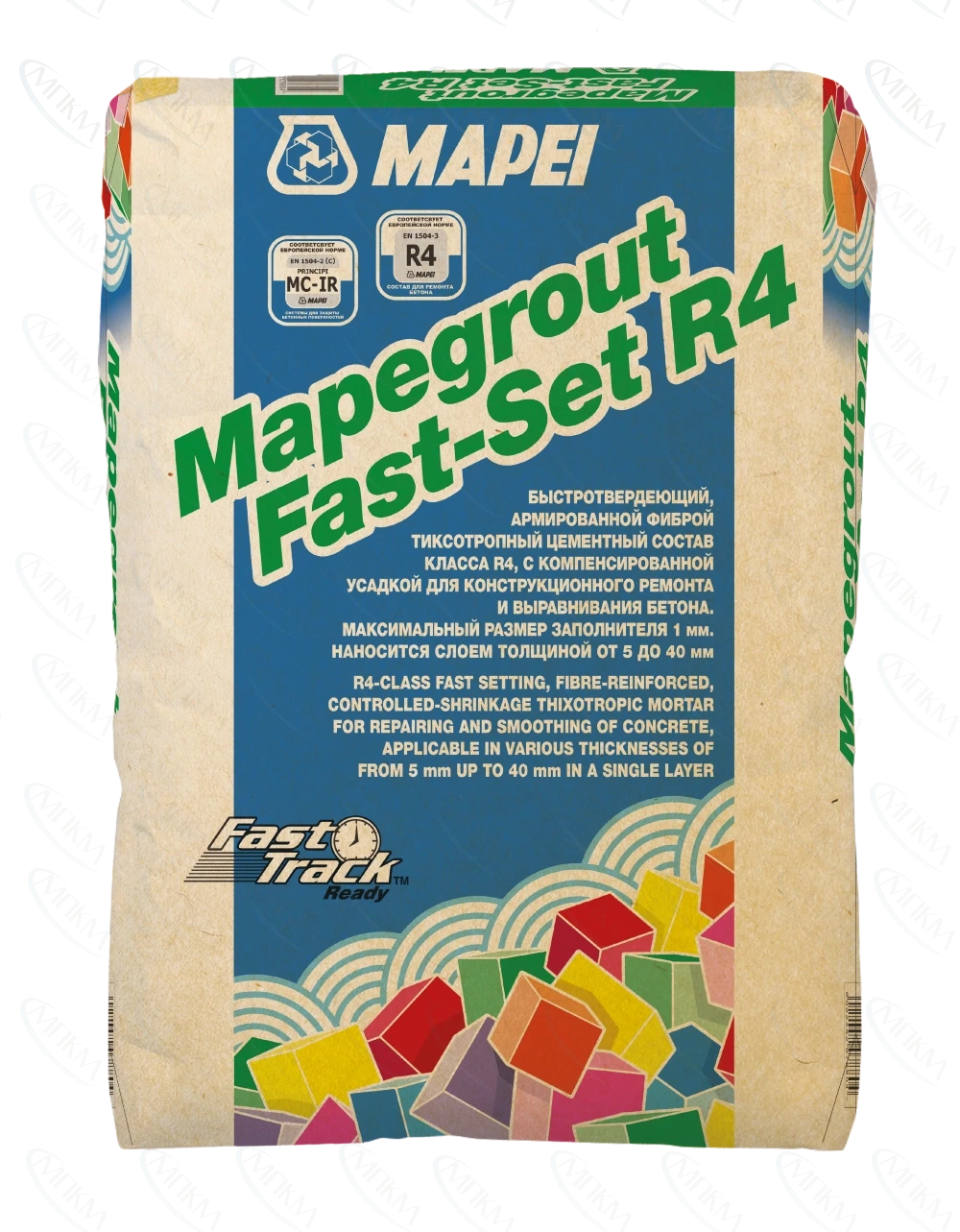 Mapegrout Fast-Set R4 — готовый к применению материал в виде сухой смеси, созданный на основе специальных гидравлических вяжущих, фракционированного песка, синтетических смол и специальных добавок, содержит полимерную фибру. При смешивании с водой образует пластичный раствор, обладающий высокой адгезией к бетонным основаниям, что позволяет наносить его слоем от 5 до 40 мм на вертикальные и потолочные поверхности без установки опалубки. В затвердевшем состоянии Mapegrout Fast-Set R4 представляет собой безусадочный, высокопрочный бетон, устойчивый к истиранию и карбонизации, воздействию хлоридов, обладающий высокой адгезией к стали и бетону, имеющий высокие показатели по водонепроницаемости и морозостойкости, термической совместимостью с циклами замораживания/оттаивания, измеренной как адгезия по EN 1542. Цена Mapegrout Fast-Set R4 указана за 1 мешок 25 кг.