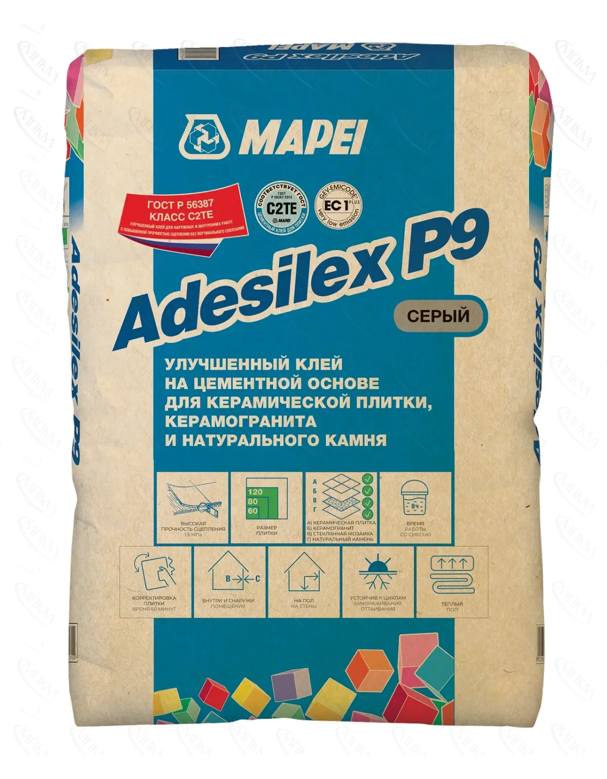 Adesilex P9 - это цементный клей (С) с улучшенными показателями (2) с нулевым вертикальным сползанием (Т) и увеличенным открытым временем (Е) принадлежит к классу С2ТЕ.