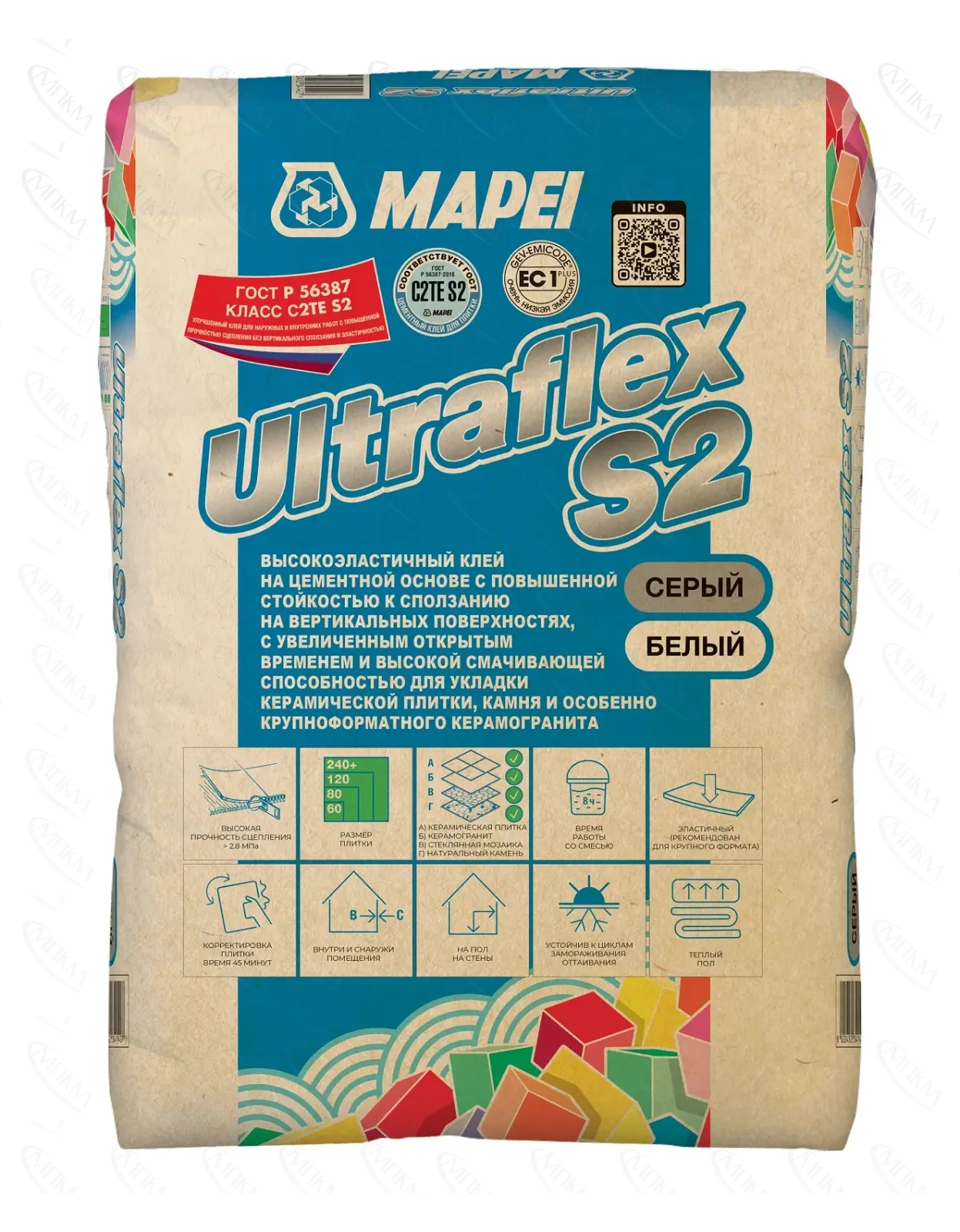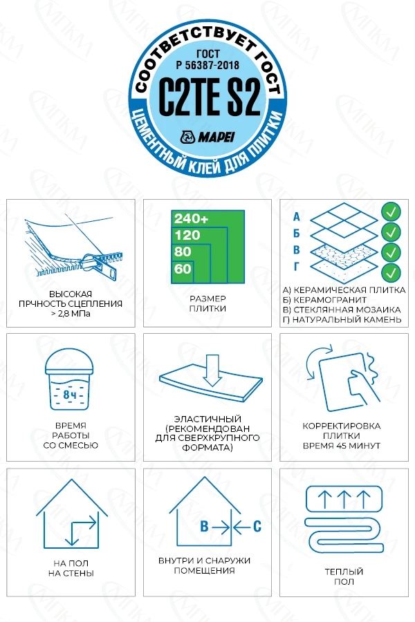Ultraflex S2 – это улучшенный (2) клей на цементной основе (C) с повышенной стойкостью к сползанию на вертикальных поверхностях (T), с увеличенным открытым временем (E), высокоэластичный (S2), класса C2TES2.
