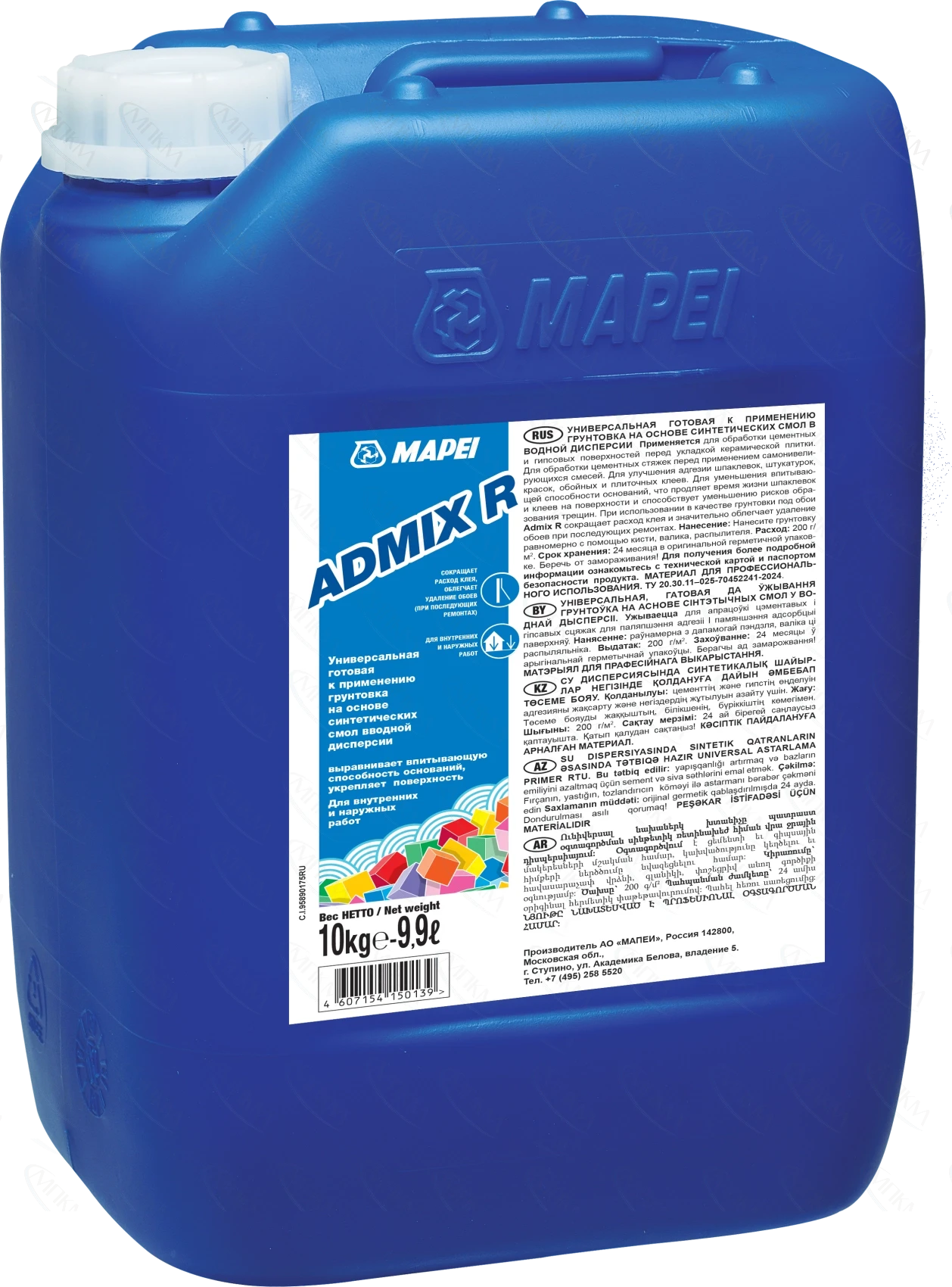 Admix R (старое название Primer RTU) — это водная дисперсия специальной синтетической смолы, которая после нанесения высыхает, образуя на поверхности эластичную плотную пленку. После нанесения на гипсосодержащие поверхности Admix R предотвращает химические реакции между сульфатами гипса и алюминатами цемента, которые в присутствии влаги ведут к образованию эттрингита, вызывающего отслоение клеевого слоя и соответственно керамической плитки от основания.